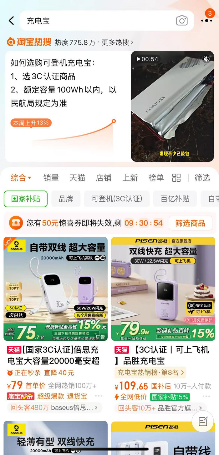 正值暑期出行高峰,为了保证出行顺利,不少网友开始在网上下单有3C标识符合规定的充电宝。