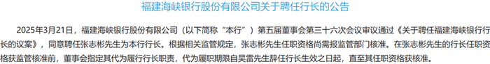 在原行长吴雷今年3月17日因任职年龄原因辞职后,福建海峡银行3月21日聘任张志彬为新任行长,后者的行长任职资格目前尚待福建金融监管局核准。