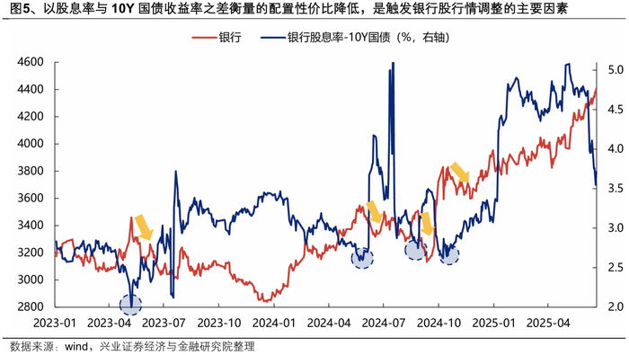 兴业证券表示,对于银行这类配置型资产来说,流动性和情绪并不是决定其配置价值的主要矛盾,配置性价比降低才是触发行情调整的主要因素。以银行股息率与10Y国债收益率之差衡量其配置性价比,历史上,当股价上升导致息差收窄至2.5%左右水平时,往往会触发行情较大幅度的调整,而当股价下跌推动息差扩大、配置性价比再度提升时,银行股行情往往能延续并再创新高。当前来看,银行股息率与10Y国债收益率之差仍在3.5%以上的较高水平,行情延续的核心逻辑未被显著破坏。随着中报季临近,可以持续关注基本面、分红率等价值指标的变化。