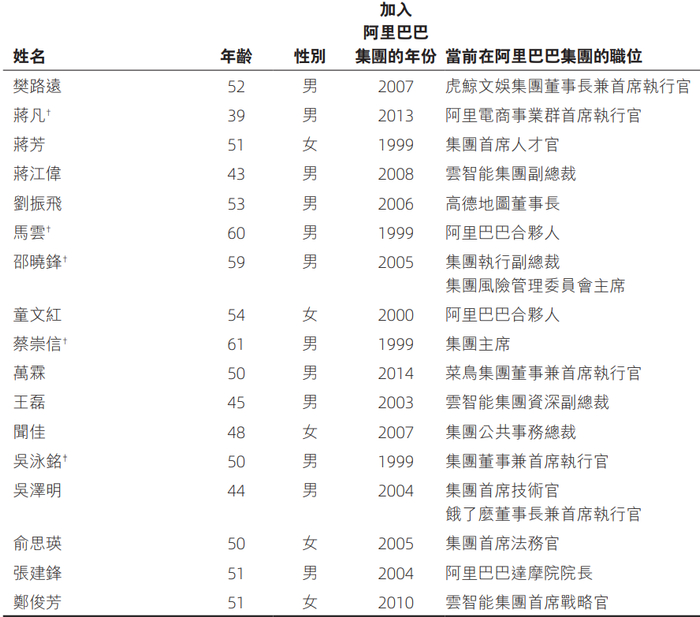 可以看到,退出的9人里有一个共同点,就是均已脱离业务一线或转任非核心职能。现任合伙人名单里,有9人为业务一线负责人,比如电商CEO蒋凡、菜鸟CEO万霖、虎鲸文娱CEO樊路远等,占比超50%。
