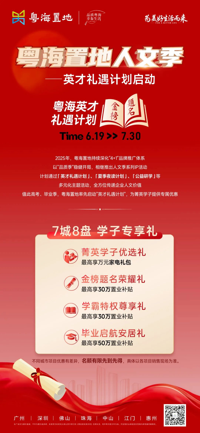 叫上你的学霸朋友们!同行还能享受组团折扣、推介奖金等额外礼遇。此次活动范围涵盖粤海置地大湾区7城8大标杆项目,近亿元优质房源诚意放送,为学子家庭提供多元化置业选择,让每个家庭都能以更轻松的方式,在粤海置地找到承载梦想的理想居所。