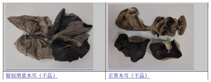 增重黑木耳用鼻嗅有较明显异味,而优质木耳无异味;同时,增重木耳泡发后大多水质浑浊黏稠,食用口感黏软、不爽脆。