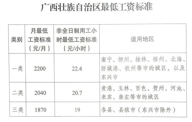 近日,自治区政府发布关于调整全区最低工资标准的通知。通知指出,根据《中华人民共和国劳动法》和《最低工资规定》有关要求,结合广西实际,决定对全区最低工资标准进行调整,调整后的全区最低工资标准自2025年7月1日起执行。
