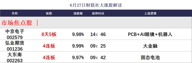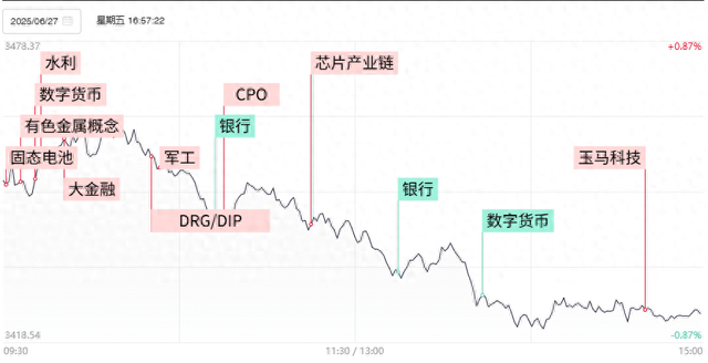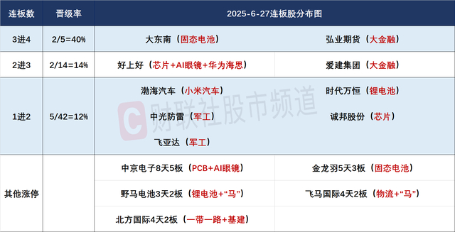 财联社6月27日讯,今日54股涨停,27股炸板,封板率为67%,弘业期货、大东南4连板,爱建集团、好上好3连板,中光防雷20CM2连板,中京电子8天5板,恒宝股份10天4板,金龙羽5天3板。市场全天冲高回落,三大指数涨跌不一。沪深两市全天成交额1.54万亿,较上个交易日缩量421亿。板块方面,有色金属、铜缆高速连接、CPO、多元金融等板块涨幅居前,银行、油气、跨境支付、白酒等板块跌幅居前。截至收盘,沪指跌0.7%,深成指涨0.34%,创业板指涨0.47%。