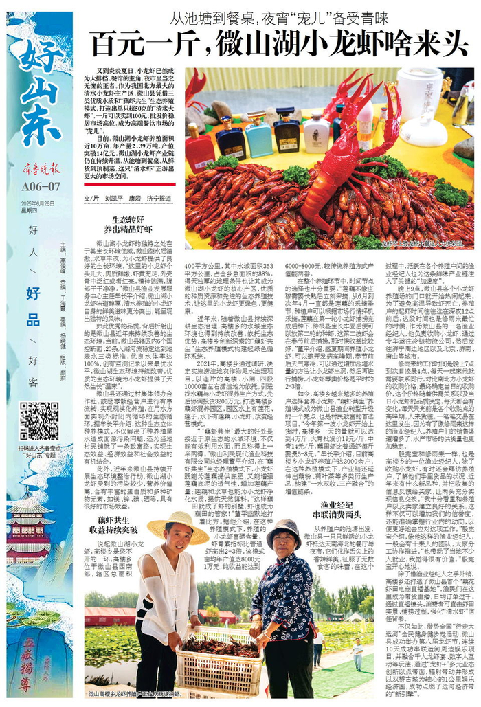 目前,微山湖小龙虾养殖面积近10万亩,年产量2.39万吨,产值突破14亿元。微山湖小龙虾产业链仍在持续升温,从池塘到餐桌,从鲜货到预制菜,这只“清水虾”正游出更大的市场空间。