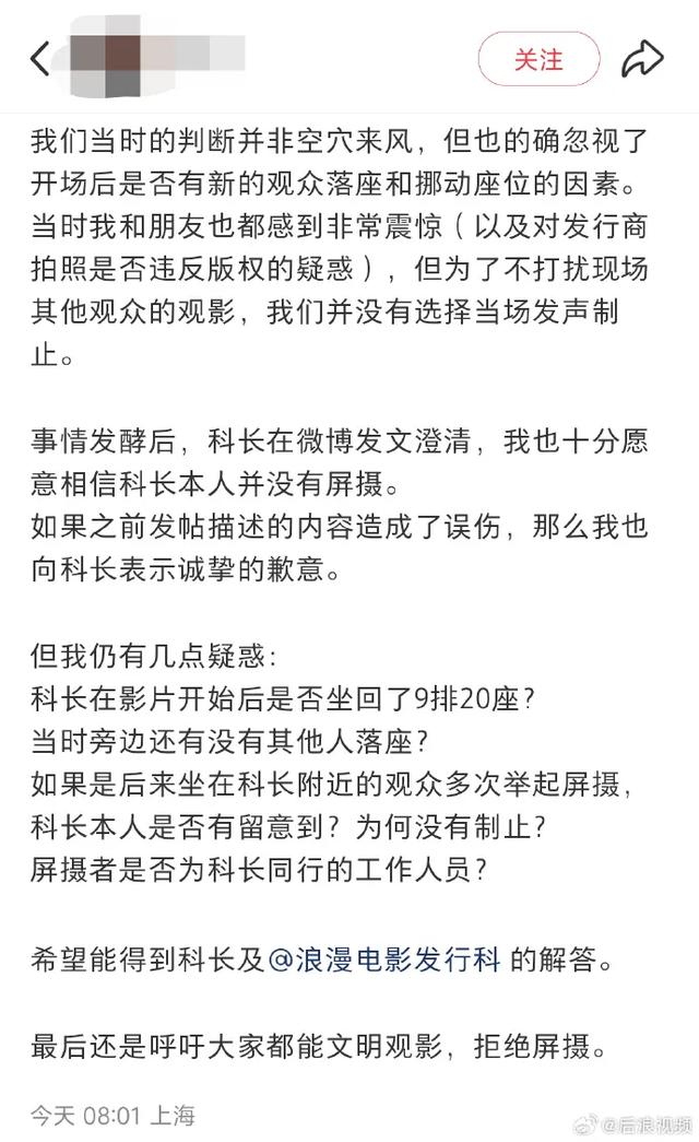 27日8时,该网友再次发文称:“当时判断并非空穴来风,但也的确忽视了开场后是否有新的观众落座和挪动座位的因素。”该网友还表示如果发帖内容造成误伤,那么他表示诚挚的歉意。随后他提出新的五连问。