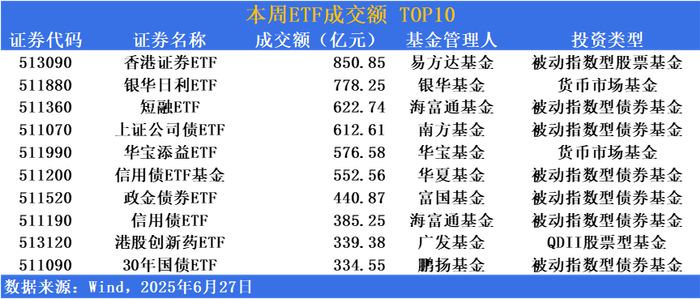 成交额方面,香港证券ETF(513090)周成交额达850.85亿元,位居榜首。银华日利ETF(511880)、短融ETF(511360)成交额分别为778.28亿元与622.74亿元紧随其后,债券类基金场内交投保持较高活跃度。