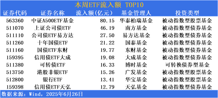 具体资金流入方面,防御类资产依旧受到青睐,债券、银行ETF成为流入主力。本期(2025年6月23日-6月26日),除中证A500ETF基金(563360)流入超80亿,断崖式领跑外。其余2-10名君实防御类资产。上证公司债债ETF(511070)、公司债ETF易方达(511110)、十年国债ETF(511260)等产品流入超20亿。