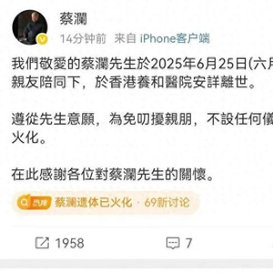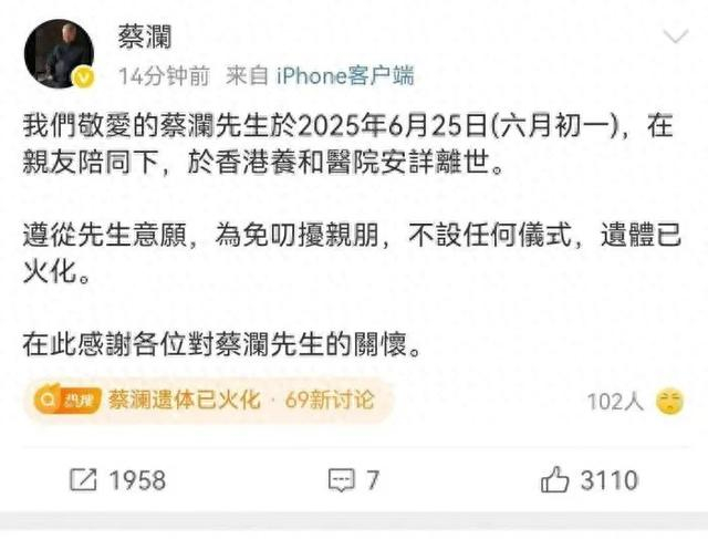 6月27日下午,沉寂许久的蔡澜社交平台突然发文宣布噩耗:“我们敬爱的蔡澜先生于2025年6月25日(六月初一),在亲友陪同下,于香港养和医院安详离世。遵从先生意愿,为免叨扰亲朋,不设任何仪式,遗体已火化。”