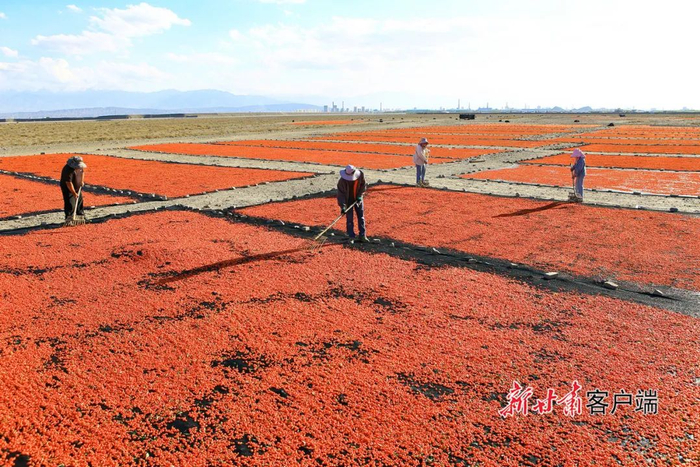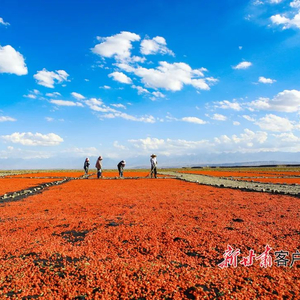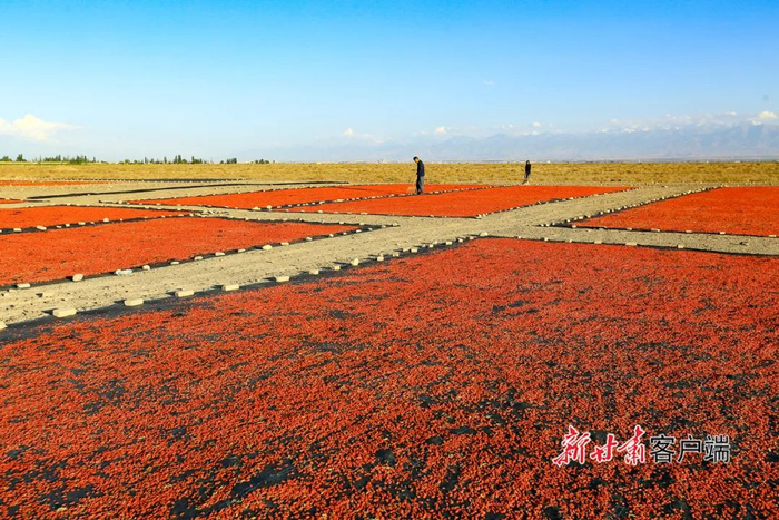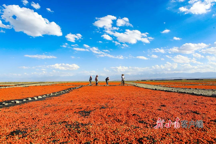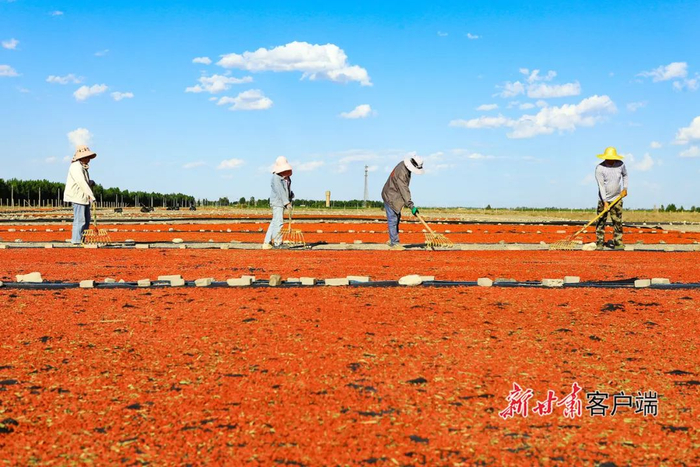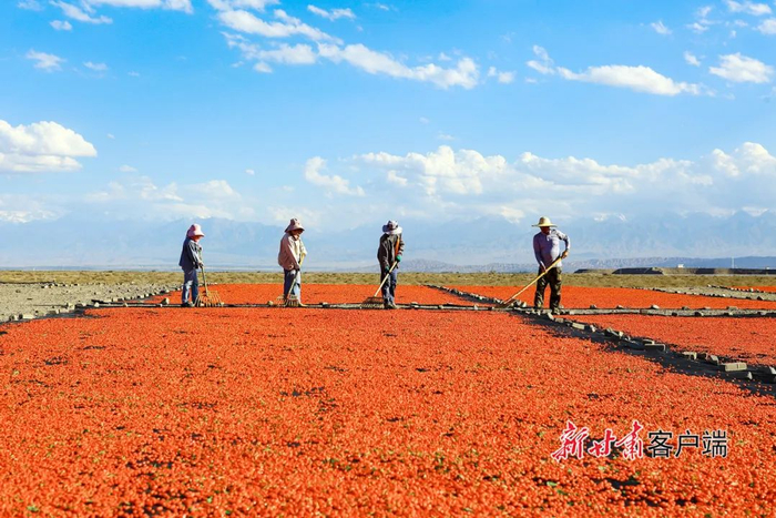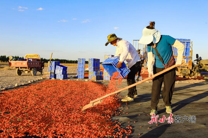 6月26日,嘉峪关市宏源公司1.89万亩头茬枸杞喜获丰收,种植户抢抓晴好天气采摘、晾晒,晾晒场上一片红彤彤的丰收景象。