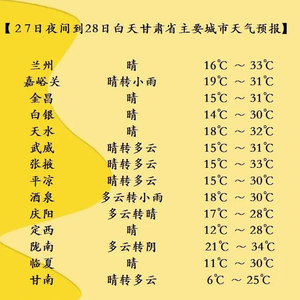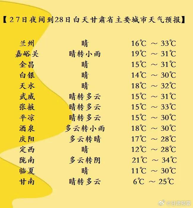 今天夜间到明天白天(6月27日20时-6月28日20时),酒泉、嘉峪关两市多云转阴,部分地方有阵雨或雷阵雨;甘南、定西、陇南、天水、平凉、庆阳等州市多云,部分地方有阵雨或小雨;省内其余地方晴或多云。