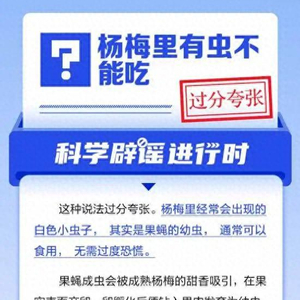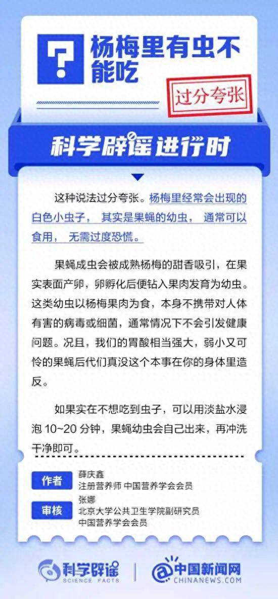 杨梅里经常会出现白色的小虫子,有人担心吃了会危害健康。实际上,杨梅中的这种小虫子是果蝇的幼虫,不会危害健康,也不会在人体寄生,无毒无害。果蝇幼虫从虫卵到出生的过程中都发生在杨梅果实中,本身是比较干净的也不会接触到其他细菌。如果不想吃到虫子,吃杨梅前可以用淡盐水浸泡10至20 分钟,果蝇幼虫就会自己出来。