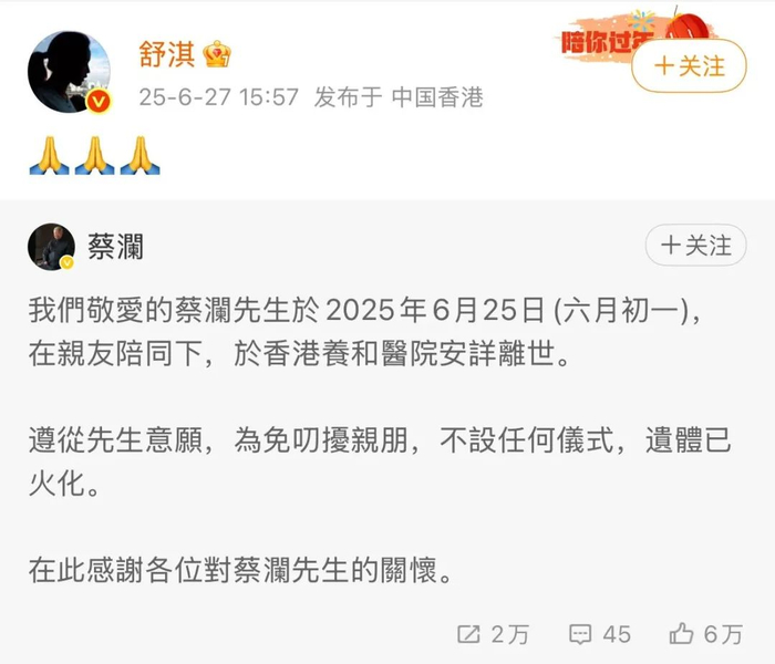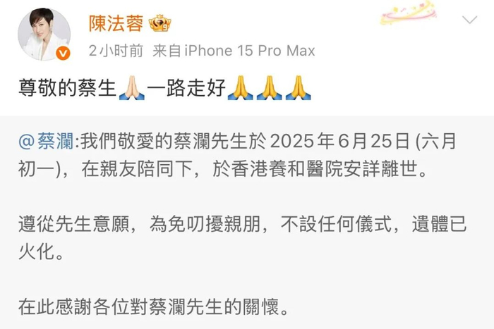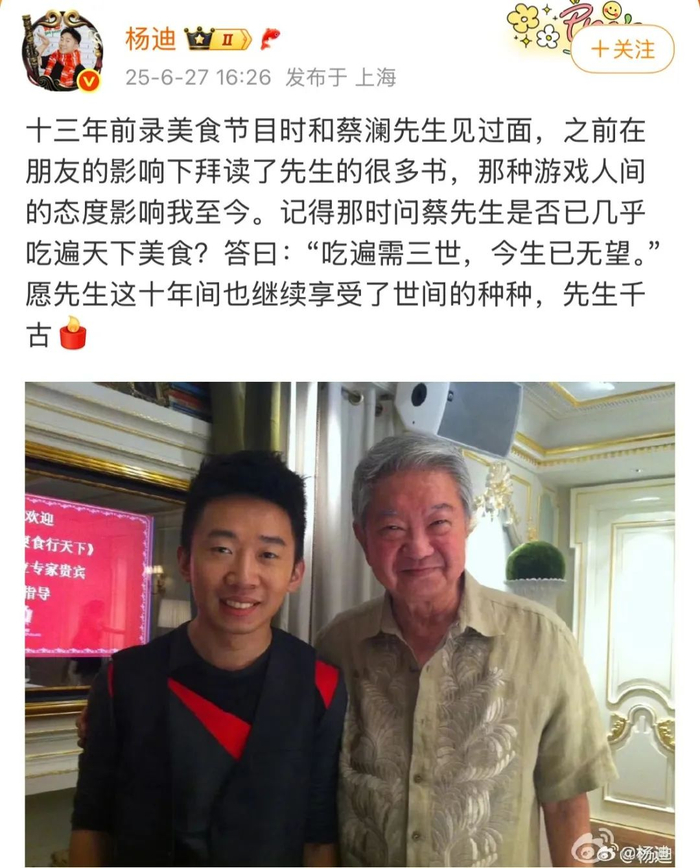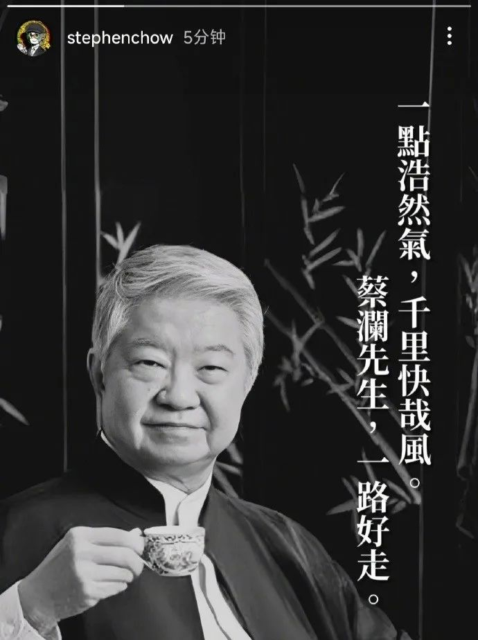 周星驰也在社交媒体发图悼念并配文:一点浩然气,千里快哉风。蔡澜先生,一路走好。
