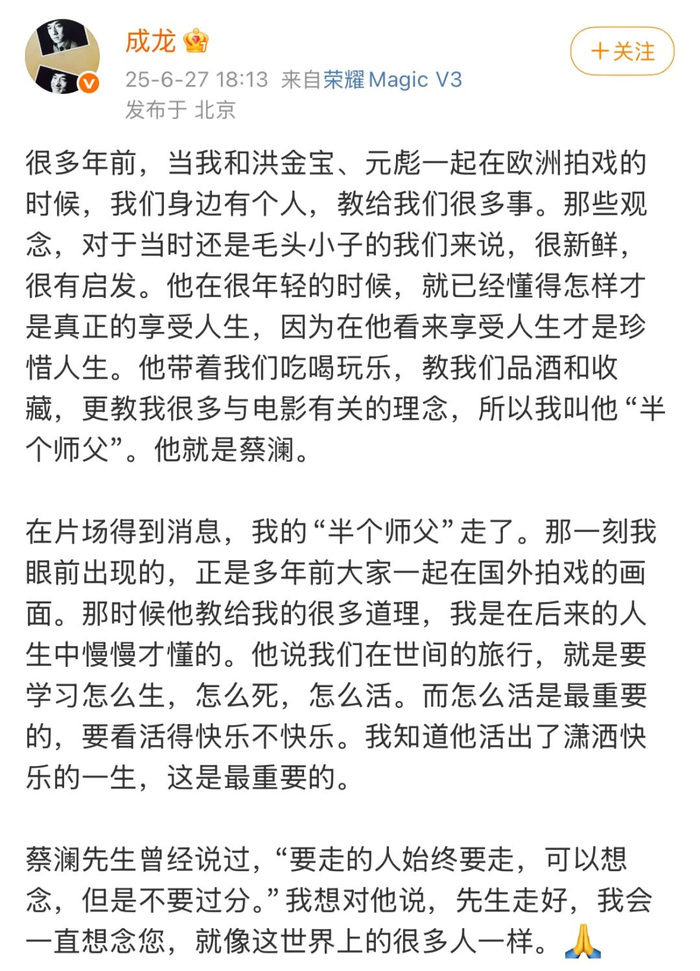成龙今日发文悼念,他写道:在片场得到消息,我的“半个师父”走了。那一刻我眼前出现的,正是多年前大家一起在国外拍戏的画面。那时候他教给我的很多道理,我是在后来的人生中慢慢才懂的。他说我们在世间的旅行,就是要学习怎么生,怎么死,怎么活。而怎么活是最重要的,要看活得快乐不快乐。我知道他活出了潇洒快乐的一生,这是最重要的。