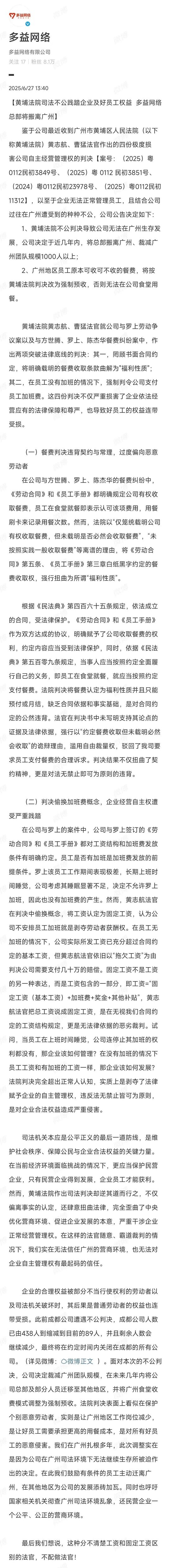 2025年6月27日下午,多益网络通过官方微博账号对外宣布,公司决定裁减广州团队规模,并计划将公司总部迁移至其他地区。