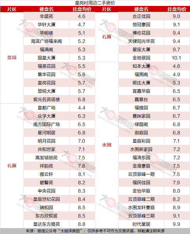 咖姐整理了皇岗村周边近一公里的房价,我们来看目前周边二手房价如何: