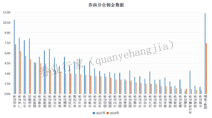 如果简单合并,“国泰”+“海通”以7.46亿元位列行业榜首,超过中信证券(7.30亿元)、广发证券(6.33亿元)、长江证券(5.62亿元)等实力强劲的对手。然而,与2023年相比,分仓佣金降幅超过37%,在TOP10中仅次于招商证券(同比下降46.59%)。