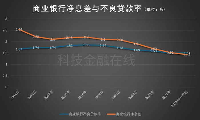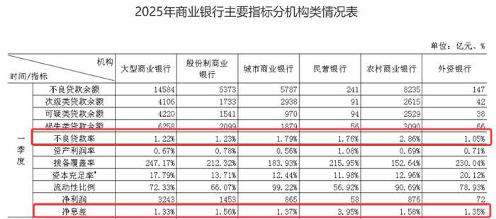 金融监管总局披露数据显示,一季度,商业银行不良贷款率为1.51%,而同期净息差为1.43%。这是不良贷款率首次超过净息差。