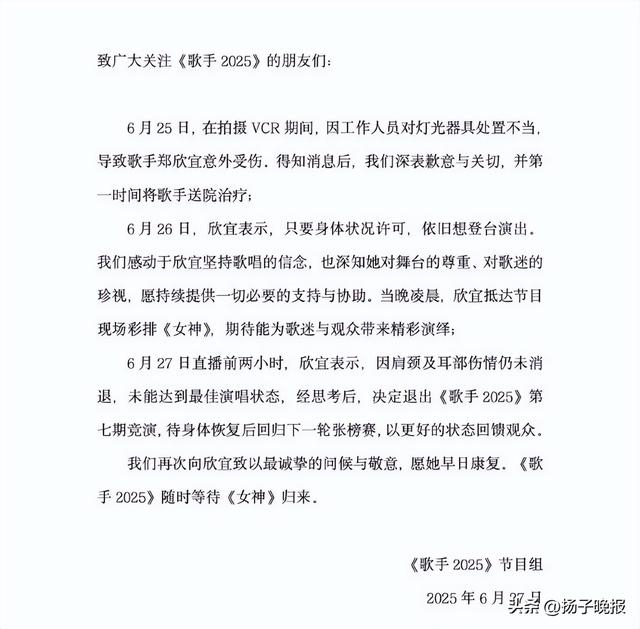 6月25日,在拍摄VCR期间,因工作人员对灯光器具处置不当导致歌手郑欣宜意外受伤,得知消息后,我们深表歉意与关切,并第一时间将歌手送院治疗。