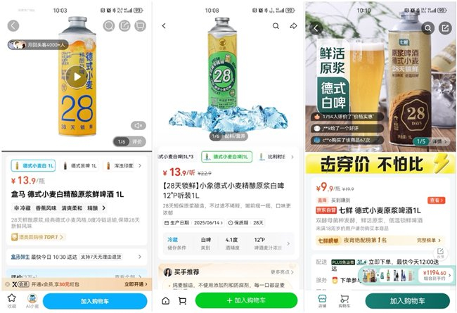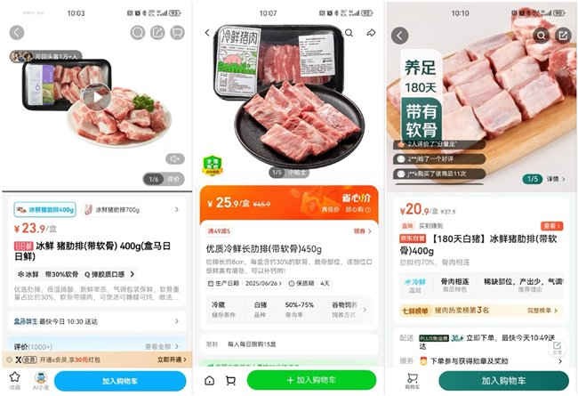 以鸡蛋、猪肋排、鲜啤酒这三类家庭餐桌常见的食品来看,横向比较盒马、小象与七鲜的价格,盒马虽然“首店优惠”后并非最贵商家,但每一项都贵于已经在津深耕七年的七鲜。