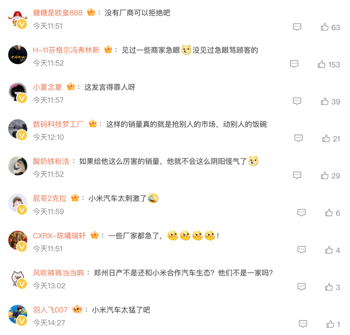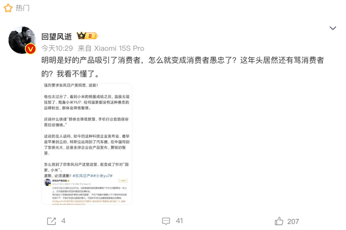 从某种程度上来说,企业高管的言行举止甚至衣着形象等方方面面往往代表了企业的品牌形象和声誉,作为企业的核心决策层和形象代表,其一举一动时刻反映着企业的价值观、经营理念以及对各种事务的态度,尤其在是面对危机时,高管的言论至关重要,因此也备受行业关注。简单来说,高管的言论和行为是企业价值观和经营理念的直接体现,因此在任职期间确实还是需要谨言慎行些。言归正传,虽然此番言论是黄照昆的个人观点,但作为东风日产高管之一,这番言论还是很快引发了大家的关注,多数米粉群体并不接受"愚忠"的标签,目前这则微博已被删除。