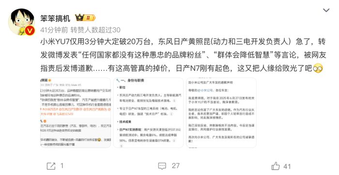 据了解,黄照昆是东风日产三电和动力开发负责人。事情是这样的,6月27日上午,微博号“东风日产新能源黄照昆”的东风日产高管在转发小米订单量微博时称:“小米YU7 3分钟大定20万台,这种数据的背后以这为用户交车时间要等待一年以上,任何国家都没有这种愚忠的品牌粉丝。”其还提到:“群体会降低智慧”,并对比手机行业,称汽车产能和提升需要几千个零部件供应链同步扩产,不是手机那么容易的事儿,可这种手机行业套路很容易拉动情绪。