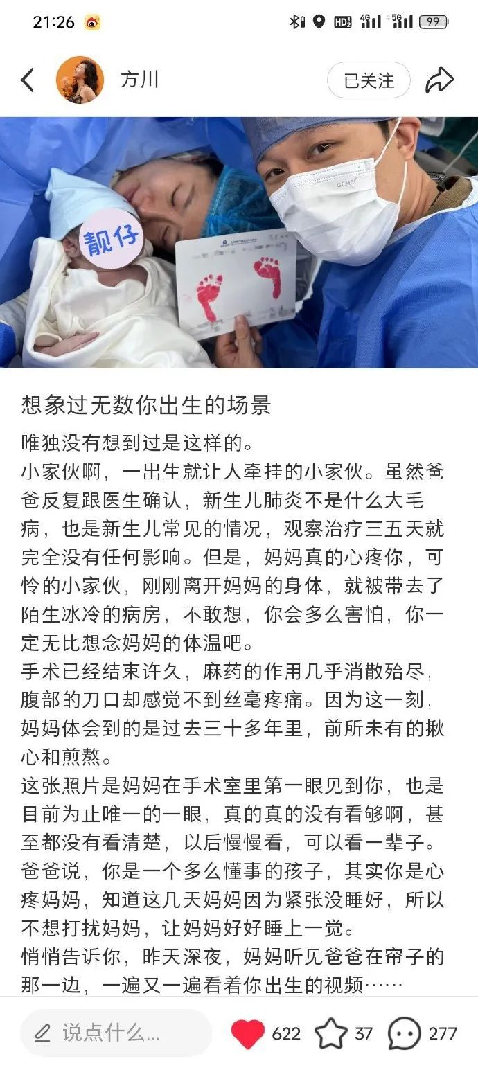 35岁妻子方川透露孩子有新生儿肺炎,“只看了一眼宝宝就被带去观察治疗了”。