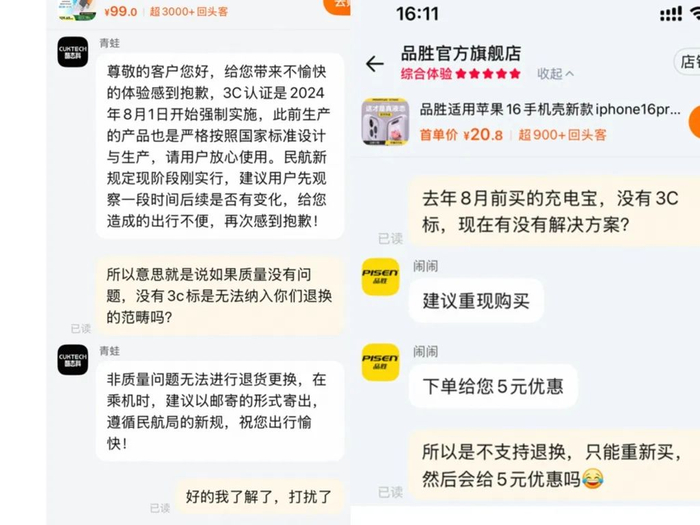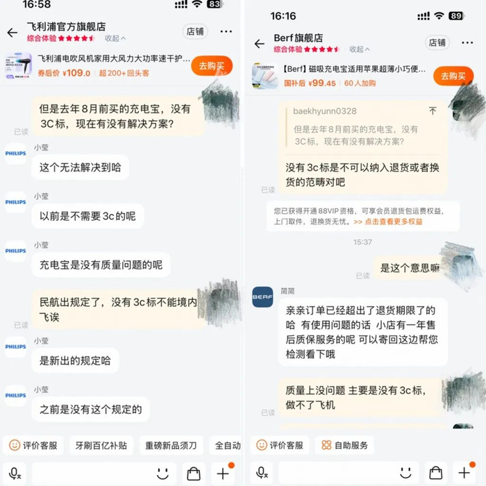 商家客服也普遍强调,国家3C认证去年下半年才发布,可能存在此前产品无3C标识,但“并不影响正常使用”。有的客服甚至建议用户:“如果需要充电宝,乘坐飞机时建议邮寄。”