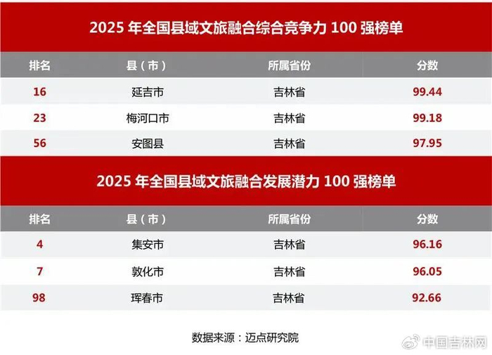 ★近日,迈点研究院发布了“2025年全国县域文旅融合综合竞争力100强榜单”以及“2025年全国县域文旅融合发展潜力100强榜单”。吉林省3地入选“2025年全国县域文旅融合综合竞争力100强榜单”:延吉市第16位,梅河口第23位,安图县第56位;吉林省3地入选“2025年全国县域文旅融合发展潜力100强榜单”:集安市第4位,敦化市第7位,珲春市第98位!
