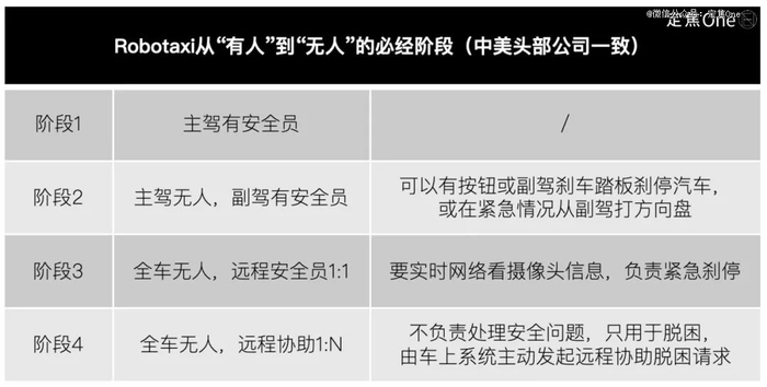 L4自动驾驶技术和Robotaxi从“有人”到“无人”,有一条必经的发展路径:从十年前的小规模、小区域、带安全员的车队技术测试,到过去两年拓展到城市全域(含市中心)、车内无安全员、商业化收费的Robotaxi打车服务,这期间,L4每个阶段同场景情况下的安全性提高数倍,才能进入下一个阶段。
