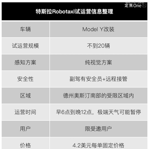 特斯拉现阶段仅有10-20辆Model Y(市场期待的Cybercab并未现身)提供服务,车辆搭载特斯拉视觉感知系统和FSD(全自动驾驶软件);服务范围限制在奥斯汀南部区域(只有谷歌Waymo的一半);乘客采取邀请制,主要面向特斯拉员工、投资者及科技博主;单次行程固定收费4.2美元,行程时长仅3到5分钟;更关键的是,副驾驶座始终配备一名安全员。