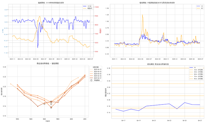 标的价格&平值期权价格指数:黑色类期货价格波动不一,纯碱涨幅为:1.96%, 铁矿石涨幅为:1.92%。螺纹钢跌幅为:0.13%。平值期权价格指数方面,铁矿石较上周有较大涨幅,涨幅为:27.61%, 硅铁较上周有较大涨幅,涨幅为:18.39%螺纹钢较上周有较大跌幅,跌幅为:17.02%;