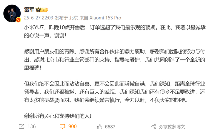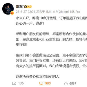 6月27日晚10:03,小米创办人、董事长兼 CEO雷军发文,称小米 YU7 订单远超最乐观预期,但绝不会因此而沾沾自喜。