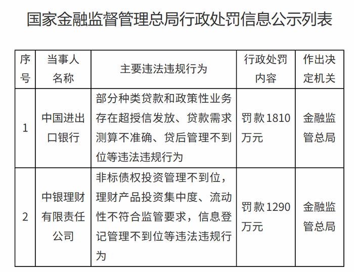 6月27日,国家金融监督管理总局发布新一期行政处罚信息公示列表。其中显示,中国进出口银行被罚款1810万元,中银理财有限责任公司被罚款1290万元。