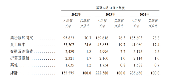 销售及分销开支由2022年的1.36亿元增加至2023年的2.22亿元,并进一步增加至2024年的2.36亿元,占收入的比例相对稳定,分别为38.8%、40%和38.8%。三年销售及分销开支合计5.94亿元。