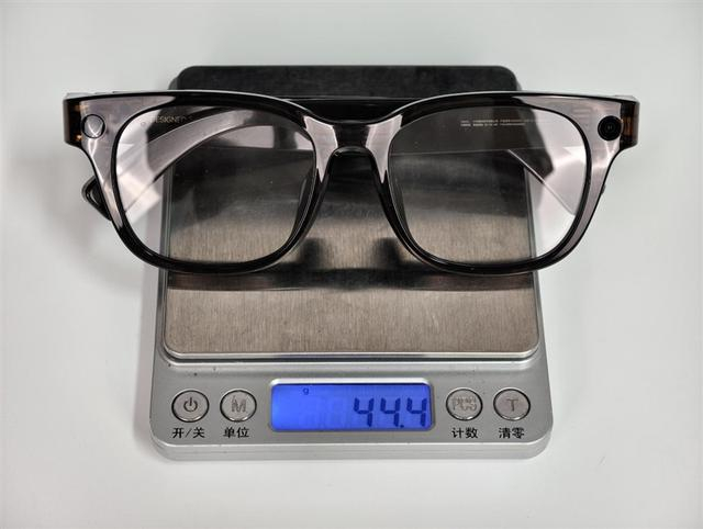 小米AI眼镜的镜框本身重量仅为40克,经过我们的实际称重,在配备平面镜的情况下,其总重量为44.4克,相比Meta轻了约4g。