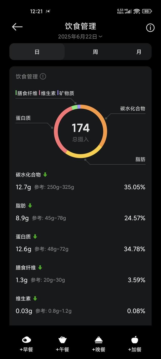 借助眼镜 APP,我们能随时查看食物热量记录。眼镜还会分析当日摄入的蛋白质、碳水及脂肪等营养物质占比,以早午晚餐、加餐形式呈现,让饮食习惯清晰可视,便于制定更合理饮食计划。