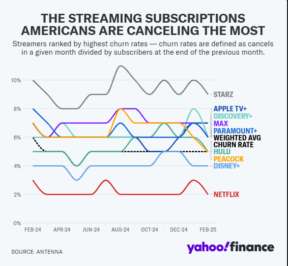 更令人担忧的是其用户粘性。研究公司Antenna的数据显示,Apple TV+的月度用户流失率高达6%,是Disney+(3%)的两倍,Netflix(2%)的三倍。用户们往往在观看完某部热门剧集后就退订了,这背后是其内容库体量过小的硬伤。由于坚持不采购外部老片库,Apple TV+的片库仅有几百部作品,远无法与拥有海量内容的对手抗衡。