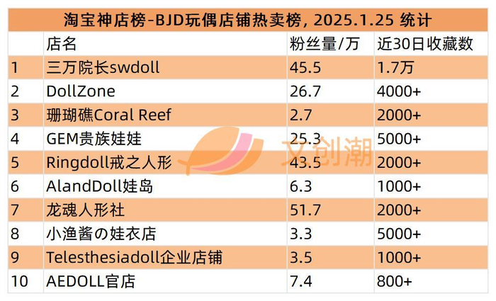 以淘宝BJD玩偶店铺热卖榜为例,今日(6月27日)排在前五名的分别是DollZone、三万院长swdoll、GEM贵族娃娃、Ringdoll戒之人形、Telesthesiadoll,粉丝量分别为28.5万、49.4万、27.2万、44.2万、4.4万。