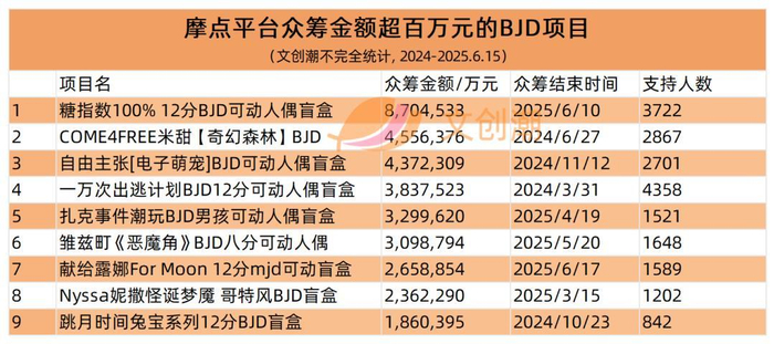 近一年多时间,仅摩点众筹就有9款产品筹集金额超过百万元(从2024年到2025年6月15日),除了魔屋阿特,还包括COME4FREE、自由主张、悸动瞬息、造次元、合玩文化、玩乐寻潮、不可食用人偶等品牌,以初创者为主。