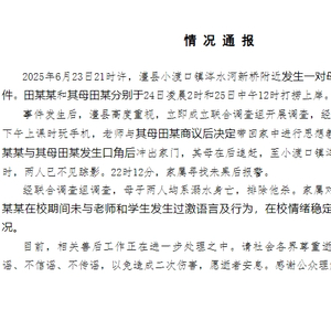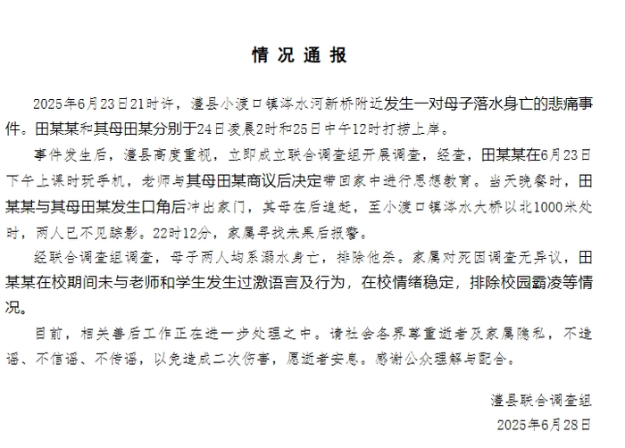 事件发生后,澧县高度重视,立即成立联合调查组开展调查,经查,田某某在6月23日下午上课时玩手机,老师与其母田某商议后决定带回家中进行思想教育。当天晚餐时,田某某与其母田某发生口角后冲出家门,其母在后追赶,至小渡口镇涔水大桥以北1000米处时,两人已不见踪影。22时12分,家属寻找未果后报警。