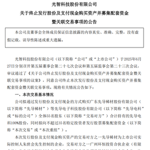 6月27日晚间,光智科技(证券代码:300489)发布公告称,公司决定终止发行股份及支付现金购买先导电子科技股份有限公司(以下简称先导电科)100%股份并募集配套资金的关联交易事项。