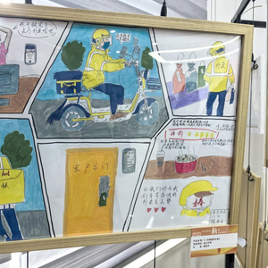 在《一次普通的外卖》的画作中,金卫中学学生薛思平勾勒出了一位外卖员穿梭在大街小巷的身影 。说起创作这幅画的初衷,她告诉记者,“外卖员很辛苦,只要我们有需要,风雨无阻为我们送餐,想通过这幅画向他们致敬。”