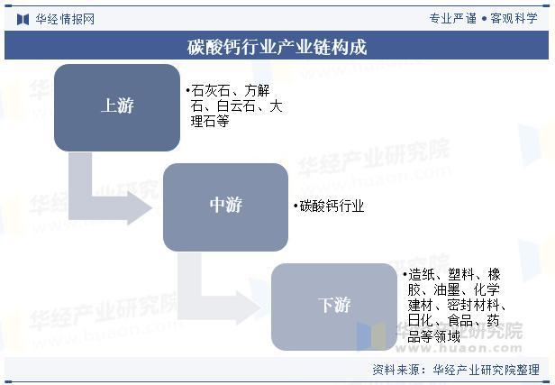 中国碳酸钙行业已经形成了较为完整的产业链,碳酸钙产业是以石灰石、方解石、白云石、大理石等为主要原料,经过机械破碎、粉磨后,形成干粉或湿粉等工序后,经过分级,形成符合不同粒度要求的产品,碳酸钙作为工业生产中重要的原料,应用于造纸、塑料橡胶、油墨、化学建材、密封材料、日化、食品、药品等诸多领域。