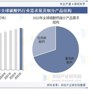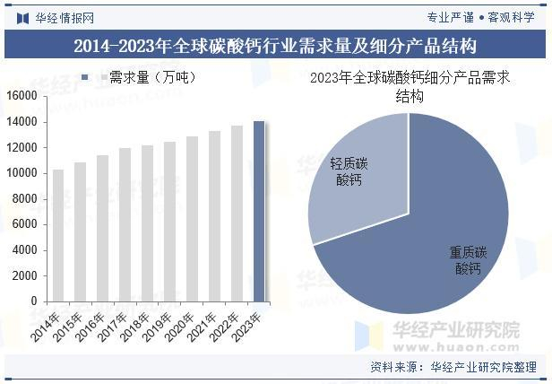 随着全球经济的持续发展和产业结构的不断调整,碳酸钙市场需求呈现稳步增长态势。2014至2023年期间,全球碳酸钙行业需求量从1.03亿吨增长至1.41亿吨,复合年增长率为3.54%,其中重质碳酸钙需求占比达70%,轻质碳酸钙占比30%。