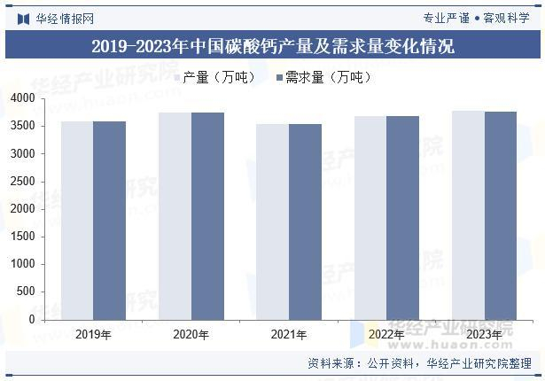 中国是世界碳酸钙生产大国和消费大国,随着下游需求持续旺盛及新应用领域不断拓展和延伸,我国碳酸钙行业产量及需求量不断增长。据统计,2023年我国碳酸钙产量约为3781万吨,同比增长2.61%,需求量约为3771万吨,同比增长2.43%。