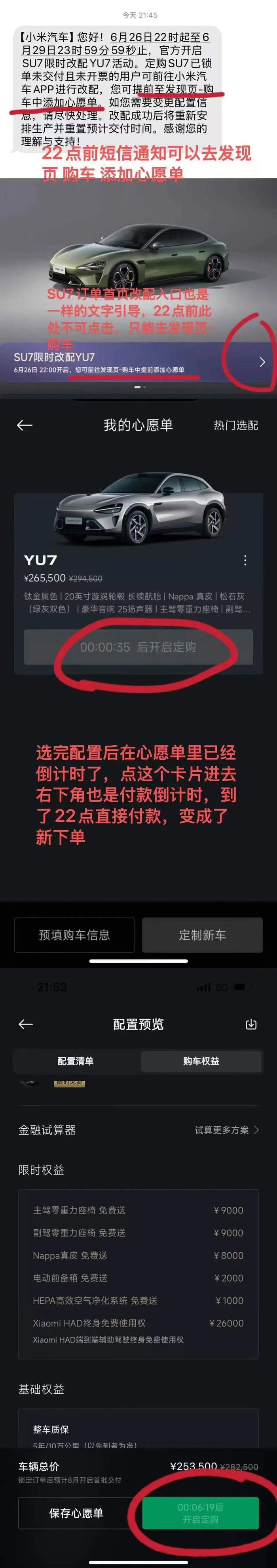 赵先生告诉都市现场记者,26日晚上10点之前,从小米汽车APP中都无法点进改配界面,于是他根据页面提示,进入发现页-购车中心,将想改配的YU7添加进心愿单。10点一到,赵先生立即在页面内点击直接购车,并支付了5000元定金。成功锁单后,赵先生才发现,自己的订单并未成功改配,而是又另外定购了一辆YU7。