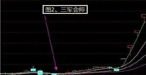 所谓三军会师,指的是5日、10日、20日三条移动平均线,从高位向下移动到低位后,抬头向上,而且汇合在一起。三线走到一起,意味着下降行情的结束,新一轮行情的开始,此时买入则是难得的赚钱机会。所以"三军会师"图线是信的过的信号,应趁回档之机。