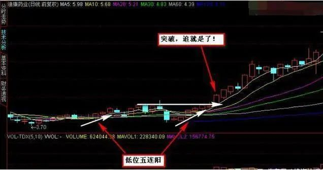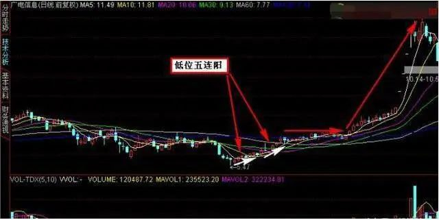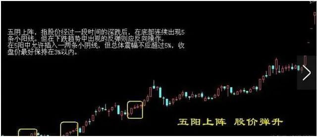 "五阳上阵",是指股价跌到低位后连续出现的五条小阳线的走势形态。这五条阳线,像五位将军,整装待发,以便攻城夺地,取代"空军",表明后市将是多方的天下。此时可随"五阳"一道,参加夺城战斗,分享未来的胜利成果。五条阳线在低位出现是,表明底部多做多的力量较强,连续五天都是多方取得胜利,"空头"已被打的无立身之地,后市股价就会趁机上升。