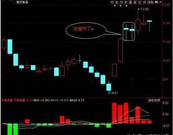 双管齐下,是下档承接有力的迹象,股价跌到某一低点后,就能迅速多头托起,说明做多的力量强大,同时也表明,在这一价位,抛压不重,后市能轻松脱离底部,形成上升趋势,在双管齐下时买进,获利机会较大。